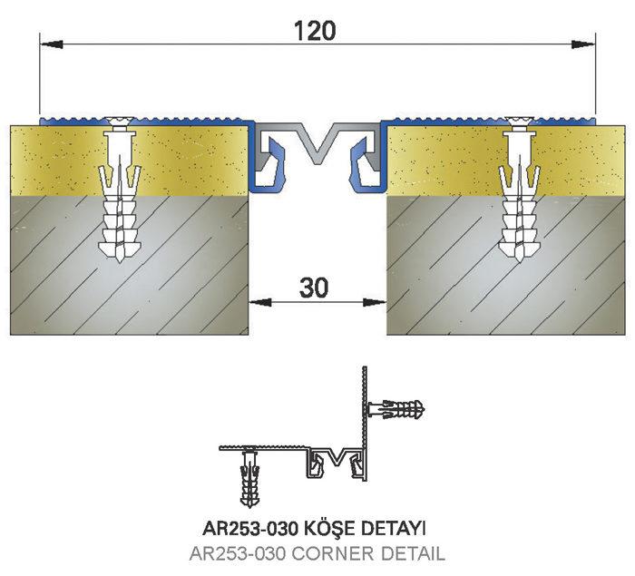 Technical Specifications Anodized, surface-to-wall ceiling dilatation profile. Openness: 20-30 mm Depth: 12.5 mm Movement Capacity: +/- 10 mm Profile Length: 3 mt
