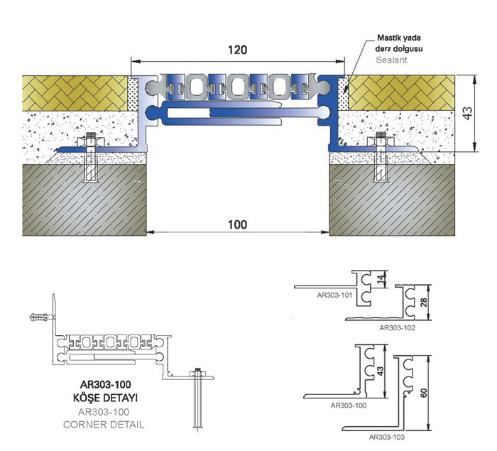Decorative, easy-to-install and heavy-duty dilatation profile used in industrial buildings, hospitals, parking lots and similar buildings. Due to its flat surface and decorative appearance, it is also common to use with granite, marble and PVC floor coverings. The profile is shipped assembled.
