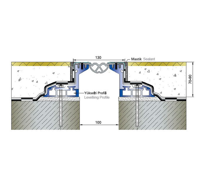Waterproofing terraces, parking lots, dilatation profile compatible with rubber added bituminous membrane providing full sealing in wet areas. The height of the foot can be increased to 90 mm with the elevation profile.So the application height 10 cm, including epoxy. It happens.