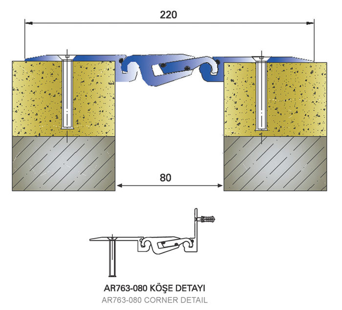 Floor dilatation profile with screw holes suitable for mounting on the veneer in industrial floors. The profile is shipped assembled.