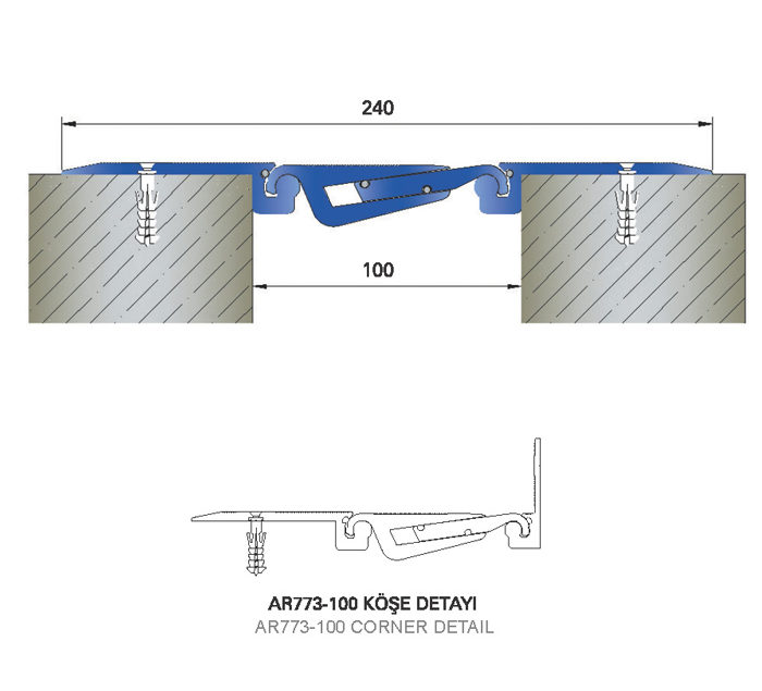 Floor dilatation profile with flat surface over the coating. Shipped with profile mounting and screw holes.