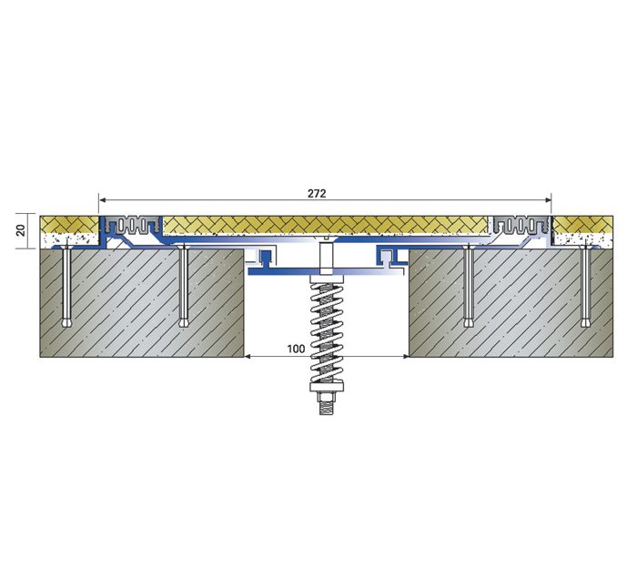 Flush Mounted Seismic Expansion Joint Floor Profile for 10cm gap. Water isolation, fire barriers are optional. It is suitable for drywall and plaster on the wall and ceiling and as well as epoxy flooring or ceramic on the floor.