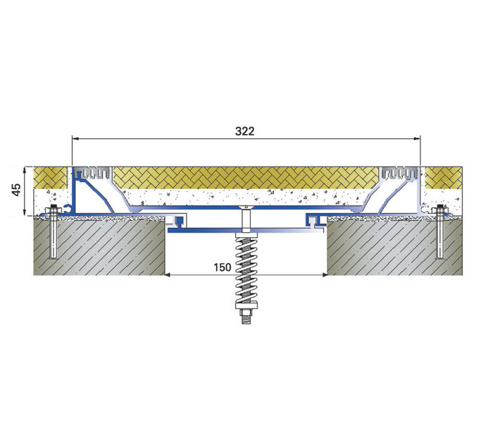 Seismic underlay ground dilatation profile for 15 cm clearance. Waterproofing, fire barrier optional.