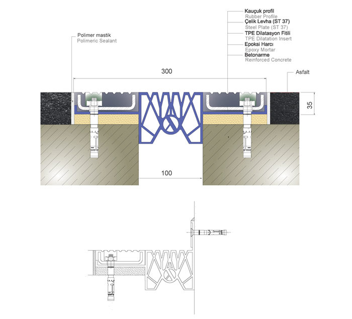 ST37 steel and rubber composite dilatation profile used in car park dilatations, bridge dilatations, building approach bridges.