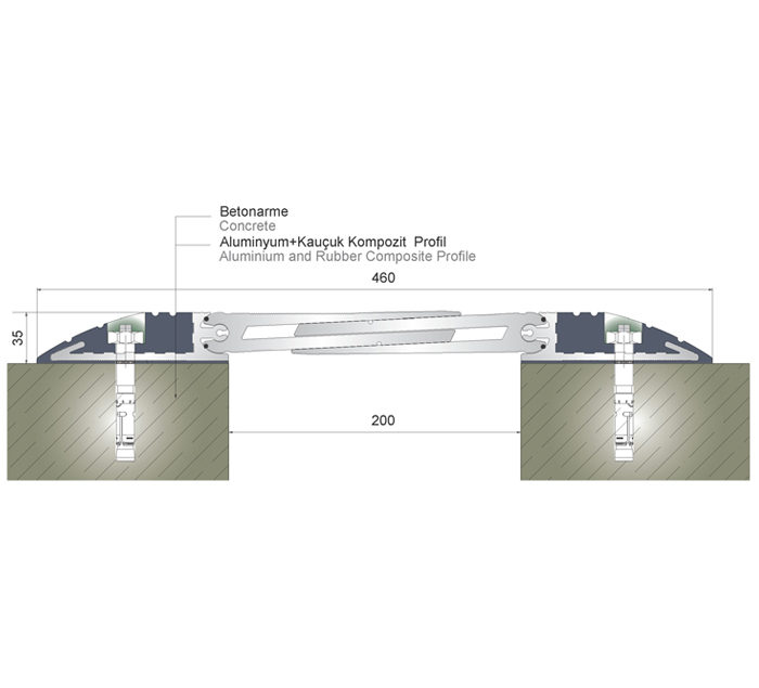 Ramp type composite dilatation profile used in car park dilatations made of aluminum and rubber.