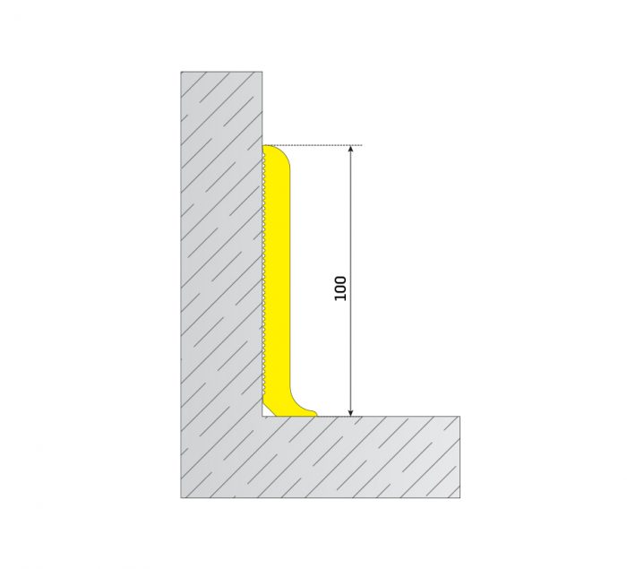 Technical Specifications 100 mm high hygienic PVC baseboard system. Color alternatives: Yellow Note: Special color production is possible for high quantity orders. Accessories HSP003: HSP100 EXTERIOR CORNER ELEMENT