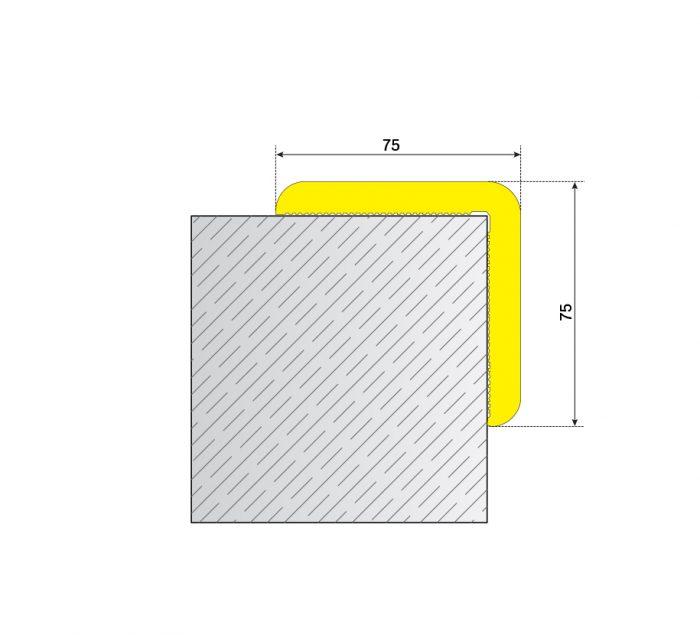Hygienic PVC corner protection system in 75×75 mm dimensions. Color alternatives: Yellow